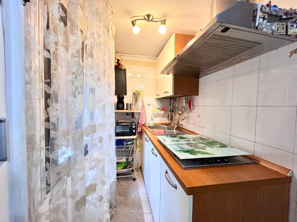 Al primo piano, la zona giorno si apre con un luminoso soggiorno e una cucina abitabile con angolo cottura.